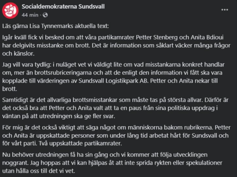 Socialdemokraterna i Sundsvall uppger att de två politikerna nekar till brott, men har tagit paus från sina politiska uppdrag i väntan på fortsatt utredning. Misstankarna sägs bland annat vara kopplade till årsredovisningen för 2024 och värderingen av bolagen.